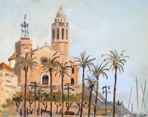 Iglesia de San Bartolomé y Santa Tecla, Sitges, Spain, oil on wood, 6x8 ins