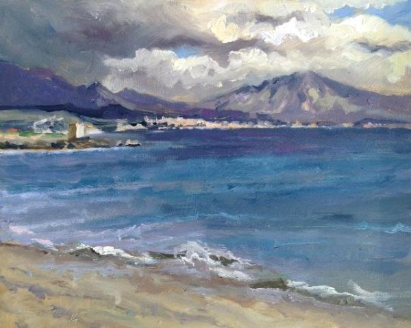 Stormy skies, towards Torreguadiaro, Spain, oil on board, 10x8 ins