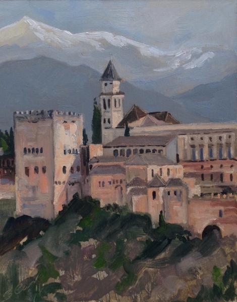 The Alhambra Palace, Granada, Spain, oil on wood, 10x8 ins