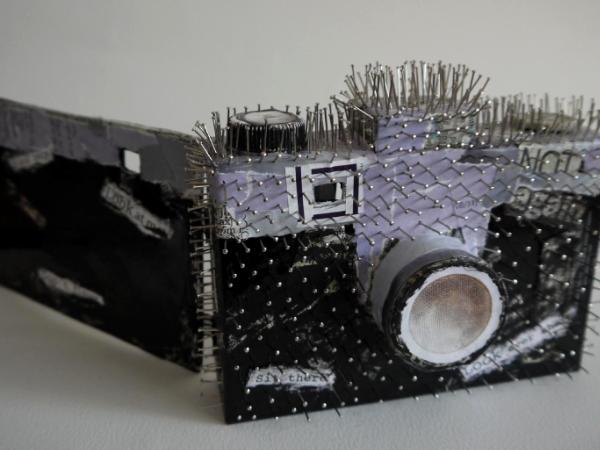 "Pin Hole Camera" by Susan Carr, 2012. Created from newspaper, magazines, cardboard and pins.